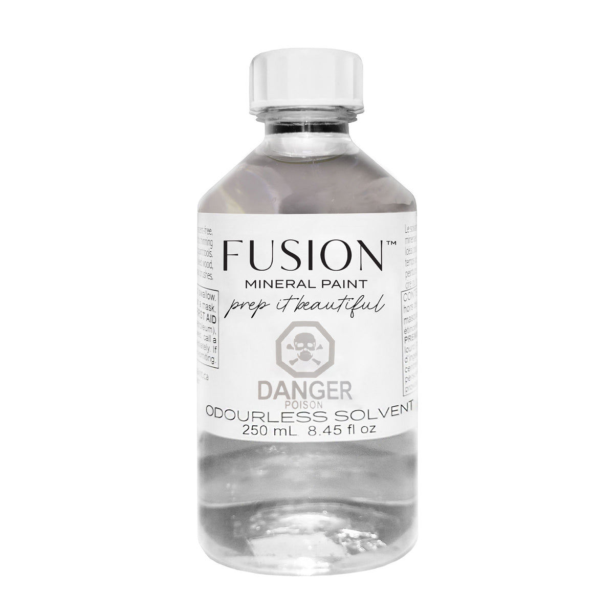 Odourless Solvent by Fusion Mineral Paint is a virtually scent-free, mild, mineral spirit. It is ideally suited to thinning oils for faster drying time and cleaning paint tools. Works well to remove wax on waxed or oiled wood, as well as cleaning wax brushes.