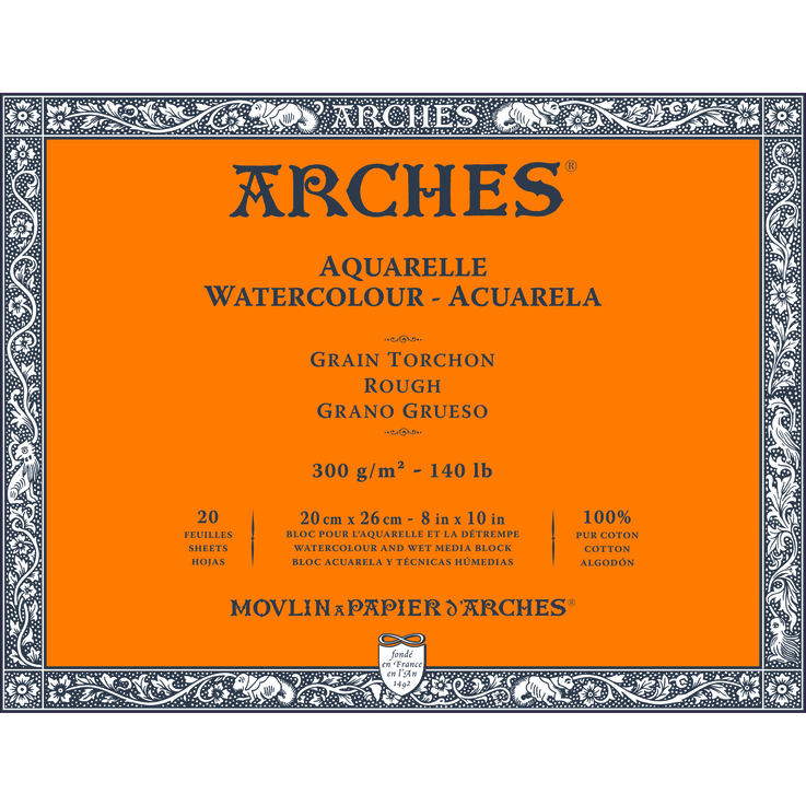 Arches Watercolor Blocks are full of 100% cotton paper of the highest quality that has been glued on all 4 sides. The convenience of painting on a block eliminates the need for stretching, so the paper is ready to use. Simply paint directly on the block and let the paper dry before removing. Each Arches block contains durable acid-free, pH-neutral, and air-dried paper which has been sized to the core with natural gelatin sizing.