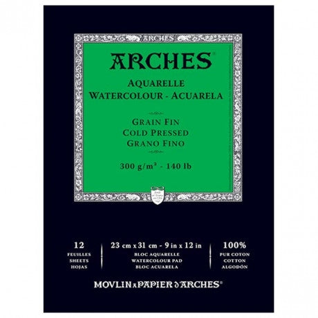 Made the traditional way, on a cylinder mould, this paper has a harmonious natural grain. The fibres are evenly distributed, making the paper more stable, with very limited deformation. Made of long 100 percent cotton fibres, ARCHES Watercolour paper can absorb a lot of water without warping or causing the colours to bleed. this pad is 9 x 12 inches and contains 12 sheets