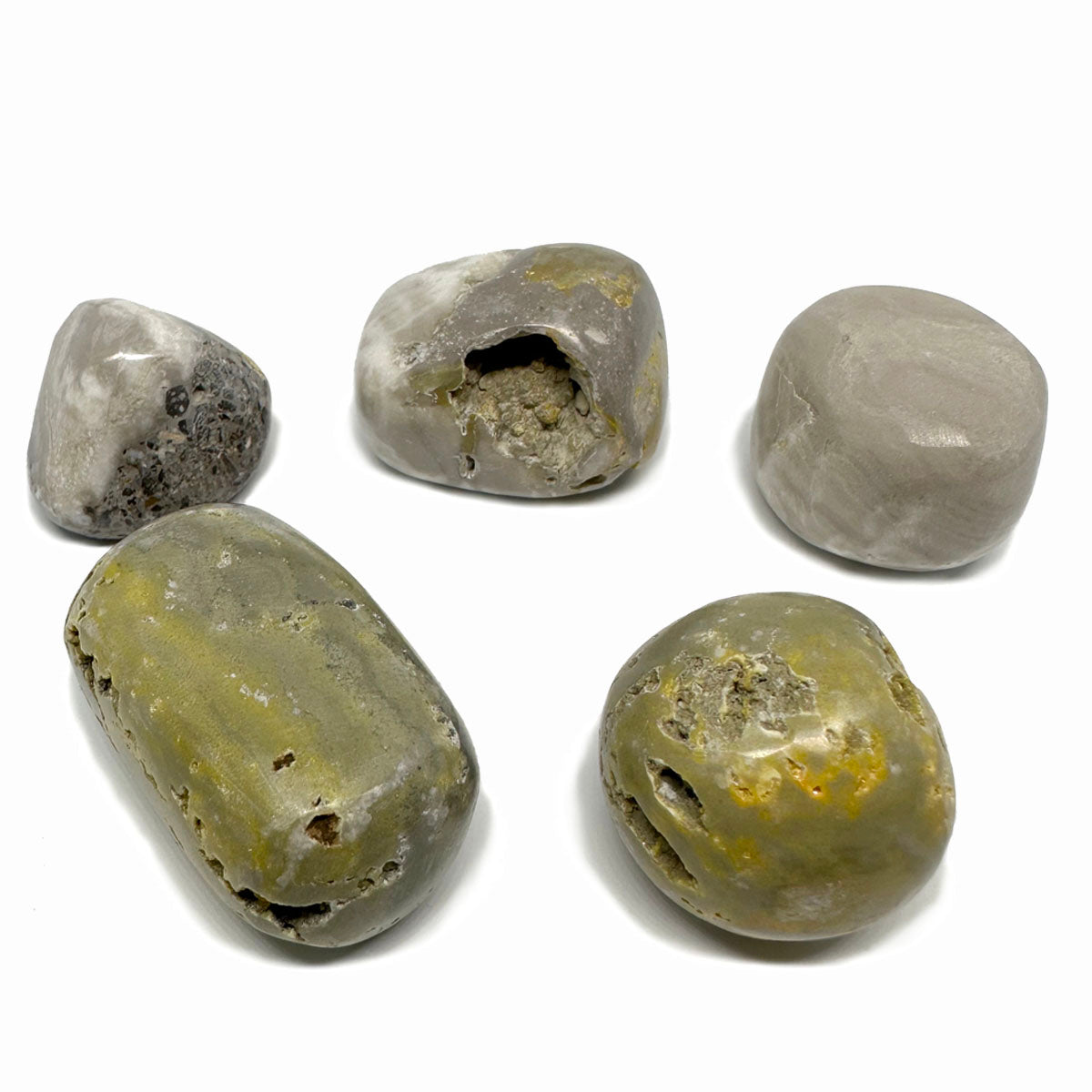 In terms of its appearance, bumble bee jasper is characterized by its vibrant yellow, orange, and black banding, which gives it a distinct resemblance to the markings of a bumblebee, though calcite and pyrite may make the stone appear more gray.