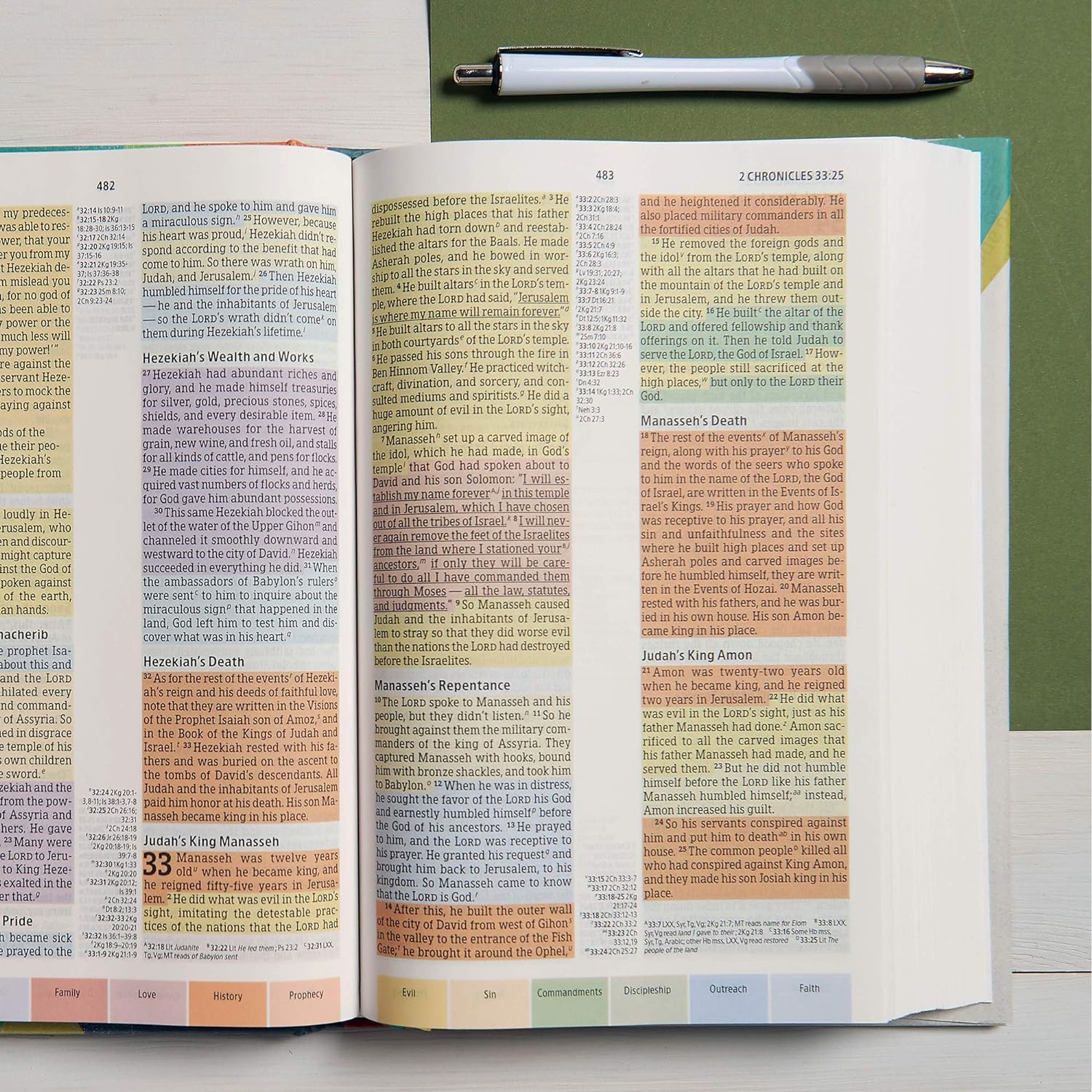 The CSB Rainbow Study Bible features a unique color-coding system that allows readers to quickly and easily identify twelve major themes of Scripture throughout the biblical text: salvation, God, family, love, history, prophecy, evil, sin, commandments, discipleship, outreach, and faith.