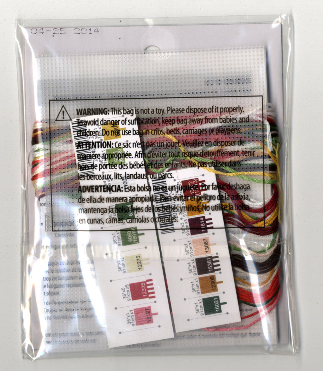 Included in the package: 14 count plastic canvas, color-coded thread palette and floss separator with presorted 6-strand cotton embroidery floss, needle and complete and easy tri-lingual instructions ~ Everything needed to complete this quick & easy XS project!