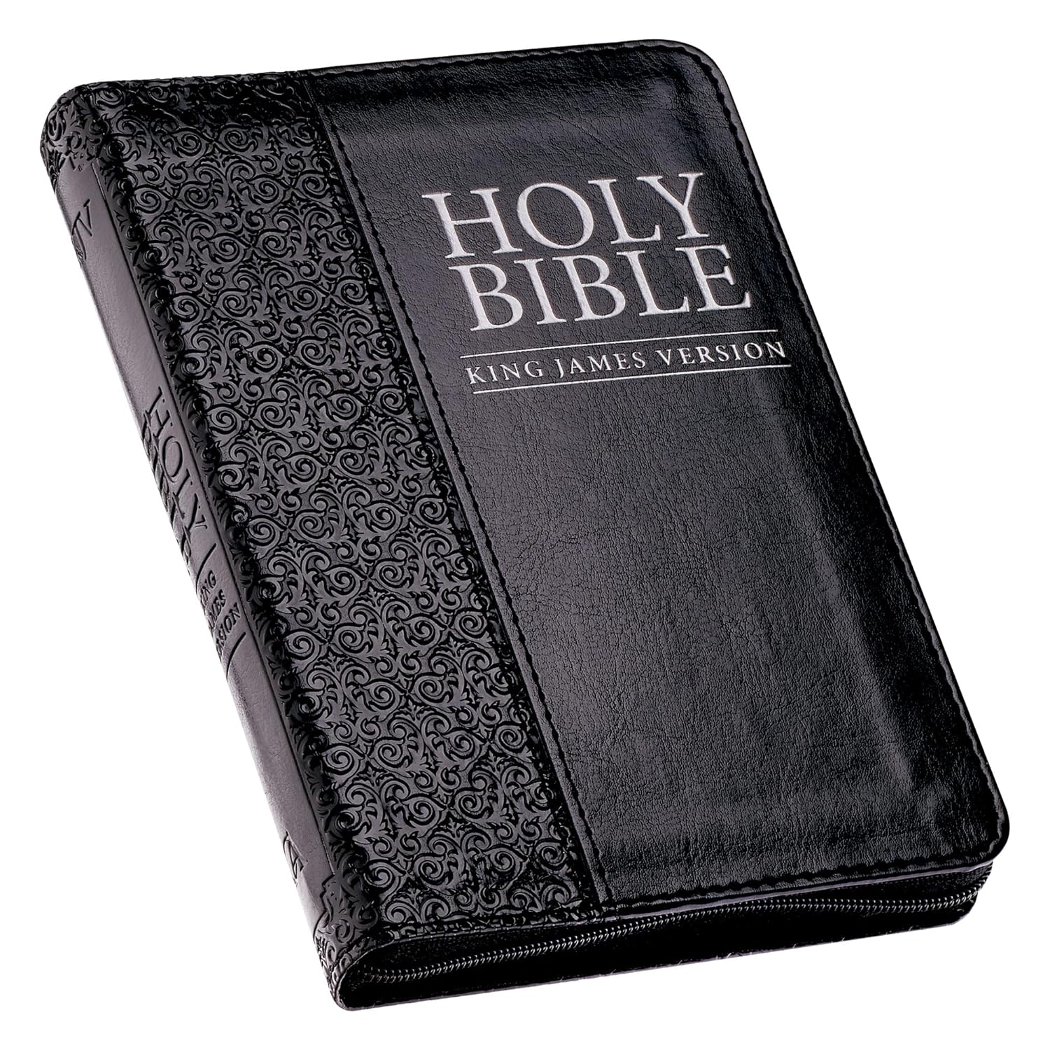 The Black Zippered Faux Leather Compact King James Version Bible is the perfect Bible to slip into a purse! The zippered closure protects the pages inside the Bible, so they will not fold or tear. This Bible opens flat for easy reading, and once opened, you will find reader-friendly subheadings, a double-column format, words of Christ printed in red ink, a thematic Scripture verse finder, a one-year Bible reading plan, and eight full-cover maps.