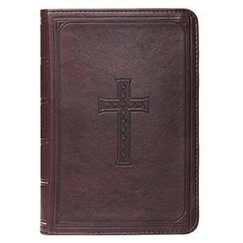 This Dark Brown Faux Leather Large Print Compact King James Version Bible combines easy in-hand portability with easy to read text. Although the Bible itself is much smaller, the text is slightly larger in size than the text of a standard size Bible (10pt). The pages are gilt-edged. Inside, you'll find a double-column format, words of Christ printed in red ink, a concordance, a helpful Scripture verse finder by topic, a one-year Bible reading plan, and eight full-cover maps. A coordinating satin ribbon marker holds your place in st