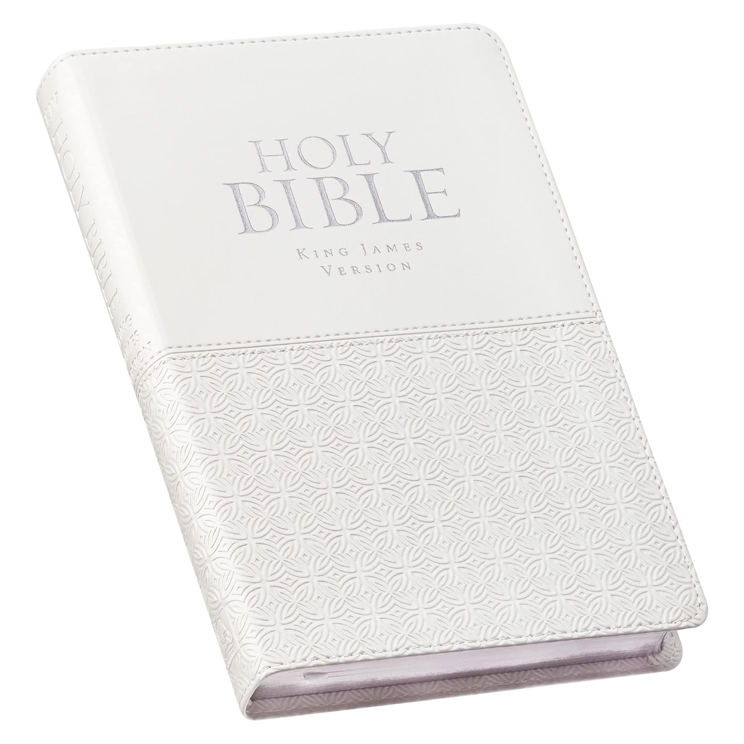 The pure white Faux Leather King James Version Deluxe Gift Bible with Thumb-index is the perfect Bible for a White Bible Ceremony. This traditional Southern ceremony takes place a week or so before the wedding. During the intimate ceremony, the bride is given a white Bible and several flowers that each represent a quality found in Christian marriage. The white faux leather King James Version Bible, with its traditional text, its the perfect fit or for an age-old ceremony. A presentation page in the front of the Bible is the perfect place to write an encouraging message to the new couple. Silver gilt-edged pages and an attached white satin ribbon page marker adds elegance to an already exquisite design. The standard 9pt type in a double-column format, thumb-index, reader-friendly subheadings, thematic Scripture verse finder, and the words of Christ printed in red will assist them in their Bible study. A one-year Bible reading plan is included to keep the couple engages in Bible reading.