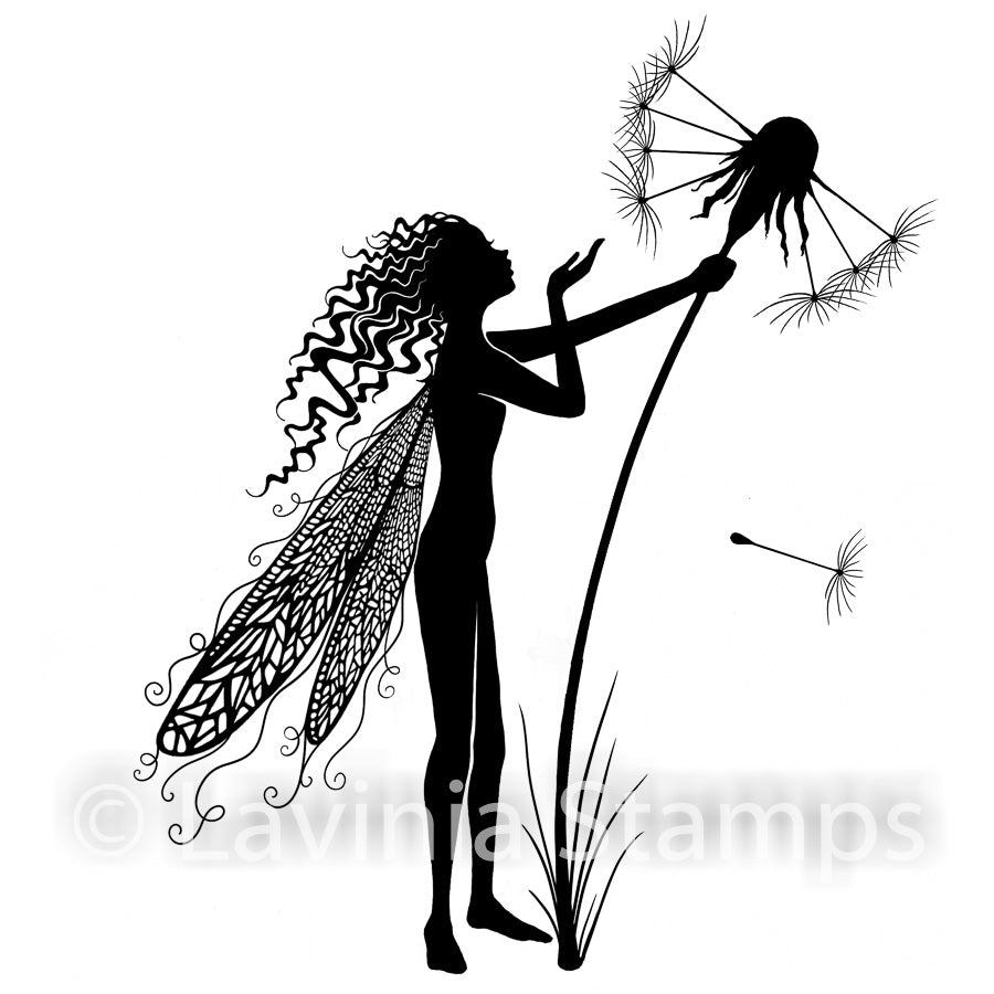 A lovely stamp of a fairy with delicate wings, wavy hair and a Dandelion flower.