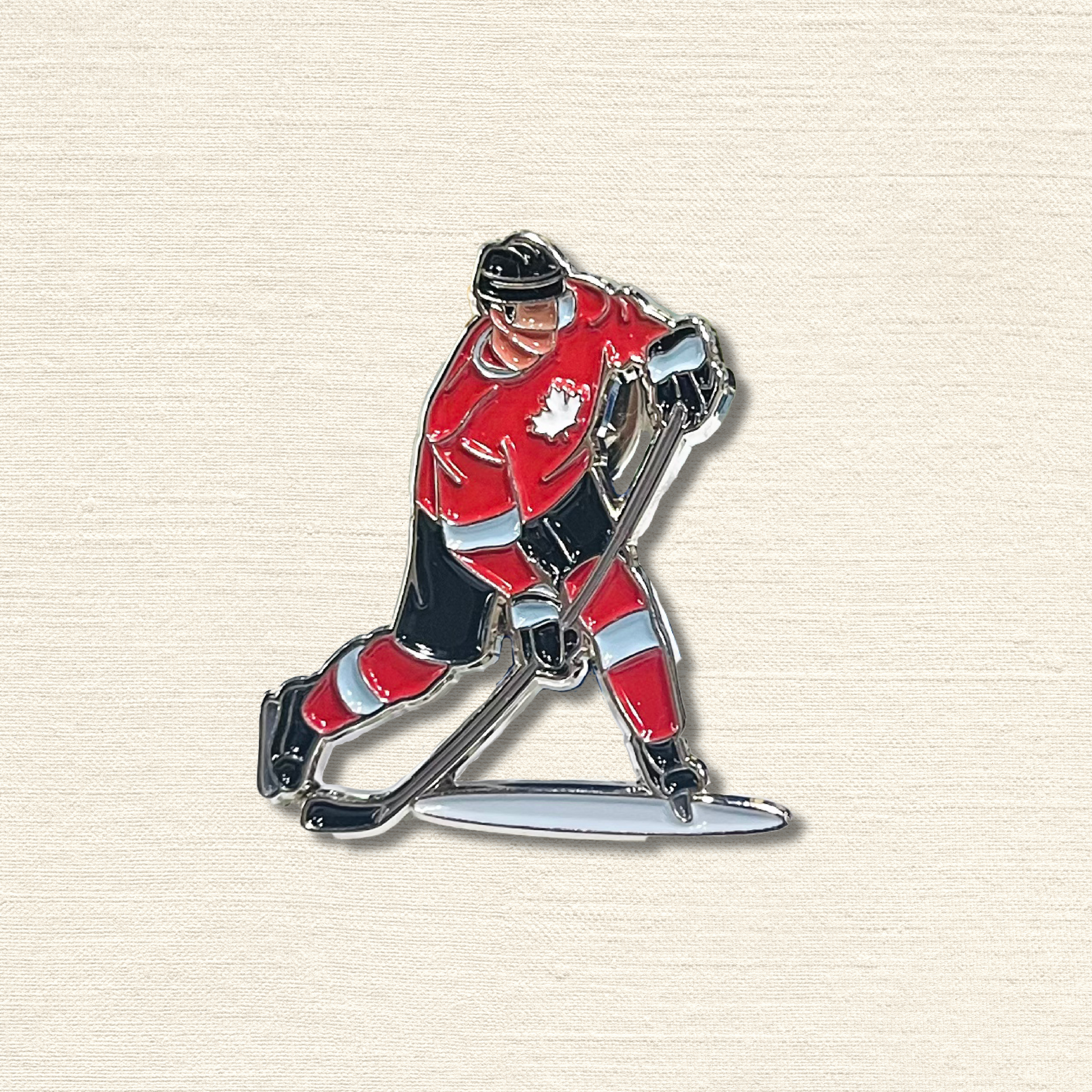 This dynamic enamel pin captures the energy and pride of Canada’s national sport—ice hockey. Featuring a player mid-action in the iconic red and white maple leaf jersey, the design evokes passion, resilience, and team spirit. With sleek lines and bold colors, it celebrates the heart of Canadian identity and the emotions that unite fans from coast to coast.