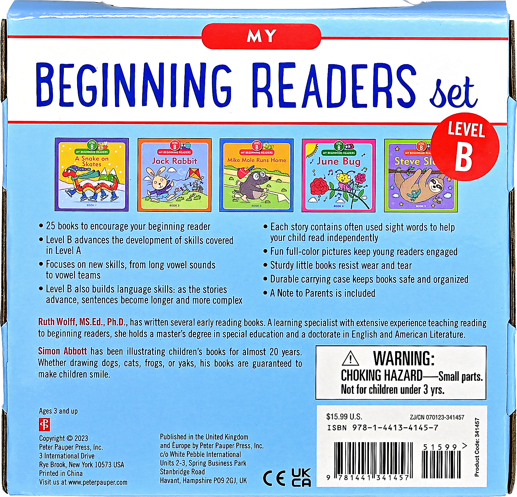 Boxed set of 25 softcover books. Each book has 8 pages. Sturdy little books resist wear and tear. Books measures 6'' square. Colorful storage case keeps books safe and organized. Storage cases measure 6.25'' wide x 6.25'' high x 1.4'' deep. Author Ruth Wolff, M.S. Ed., Ph.D. , is a
