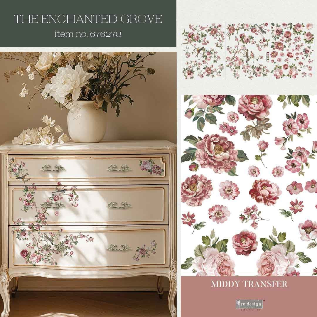 Middy Décor Transfer® by Kaćha – The Enchanted Grove, a three-sheet set designed for layering and mixing into various projects. These beautifully detailed florals can be used alone or combined with other elements from this collection for a seamless, elegant finish. Whether enhancing furniture, trays, or decorative accents, the three 8.5″ x 11″ sheets allow for endless design possibilities.