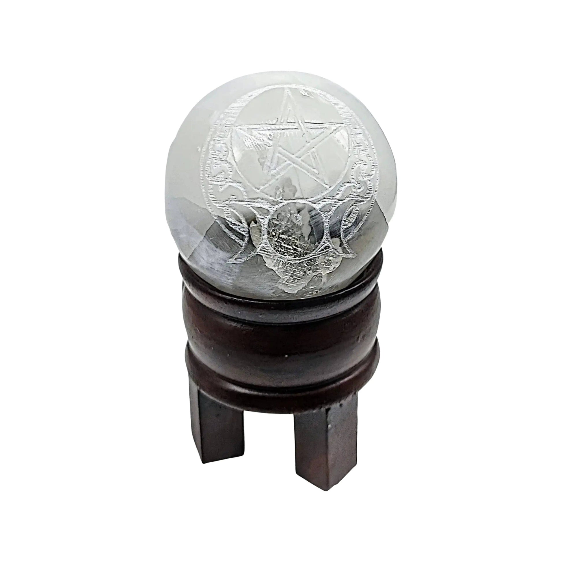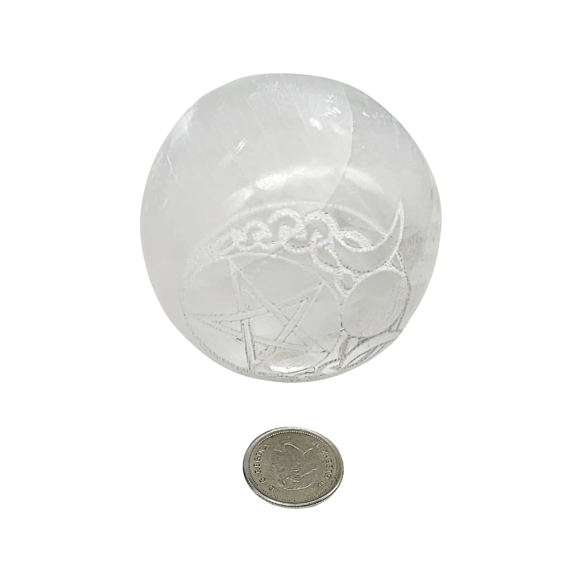 Arômes & Évasions : Selenite Sphere 2'' - Triple Moon & Pentacle Engraved
