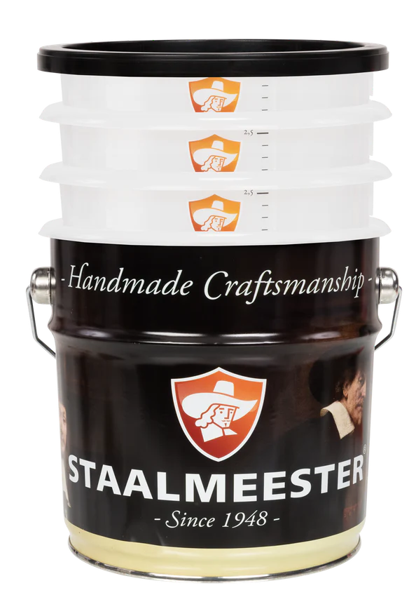 The Staalmeester® Kettle Set includes a high-quality metal paint kettle, four durable insert containers, and a matching lid. It’s the ultimate tool for mixing paints, lacquers, or even custom colours.