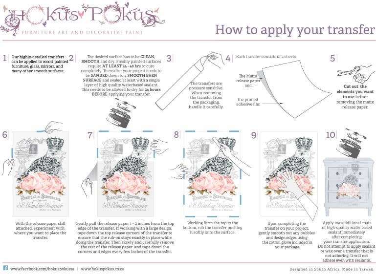 A detailed instruction sheet is included in the packaging. They're Large Transfers now come in a 6 Part Design for easier handling and application. Hokus Pokus Decor Transfers are highly detailed and stylish and can be applied to a variety of smooth surfaces, including wood, painted furniture, glass, mirrors, and more. We offer rub-on transfers that can be cut out and used for a variety of art projects. To create a piece of art, you can remove the backing paper and rub it onto your favourite project.