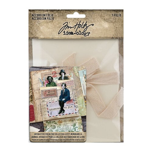 This Accordion Folio is designed by Tim Holtz for Idea-ology. This folio opens up and features a flap for storing photos or cards, a flap with three pockets to decorate, and another half flap on the right side to decorate and embellish. There is another flap at the bottom middle that folds up that also can be decorated. This folio closes with a wide linen ribbon in the front.