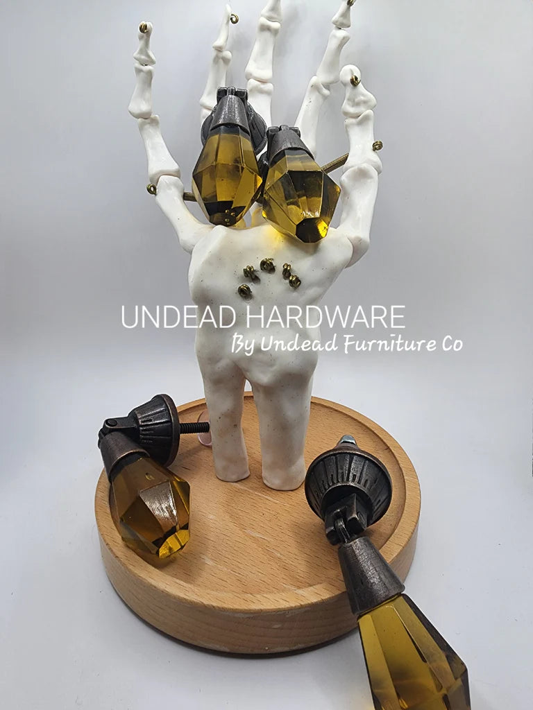 These gorgeous pieces are custom designed and exclusive to the brand. Each package comes with 4 golden colored glass drop pulls with all of the needed bolts, washers, and spacers for mounting.