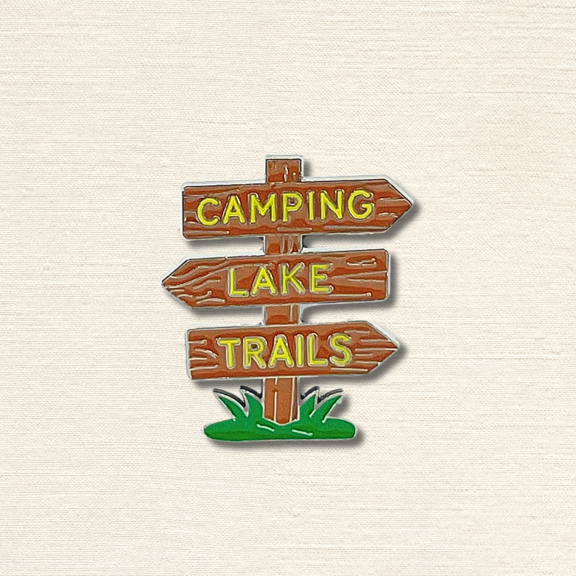 Inspired by rustic wooden trail signs, this enamel pin points the way to “Camping,” “Lake,” and “Trails.” With its clean lines and earthy colors, it captures the spirit of outdoor adventure, freedom, and a love for nature. A charming tribute to the joy of exploration.